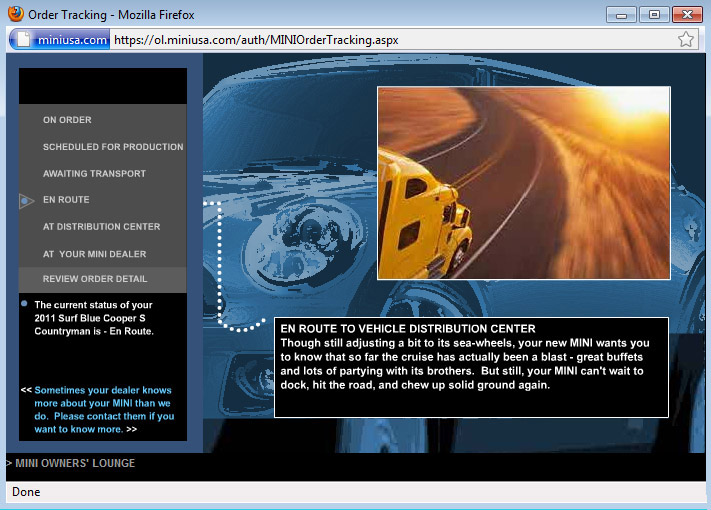 OK - I ordered a MINI Countryman (also Surf Blue with a black roof and black stripes) on 4/21/11 and it is now en route. My MA states that he has no idea as to what ship it is on. I told him that other owners on the MINI forums know what ship their MINIs are being transported on and he asked me to ask how do they know. Any idea on how I can help him get a clue??
